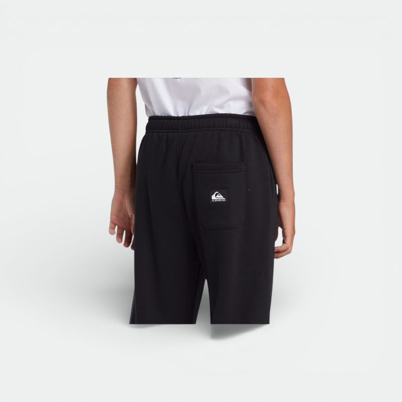 Diseño Gráfico Distintivo: Presenta una serie de logotipos icónicos de Quiksilver (la montaña y la ola) estampados verticalmente en la pierna izquierda en un color azul vibrante que resalta sobre el fondo oscuro.